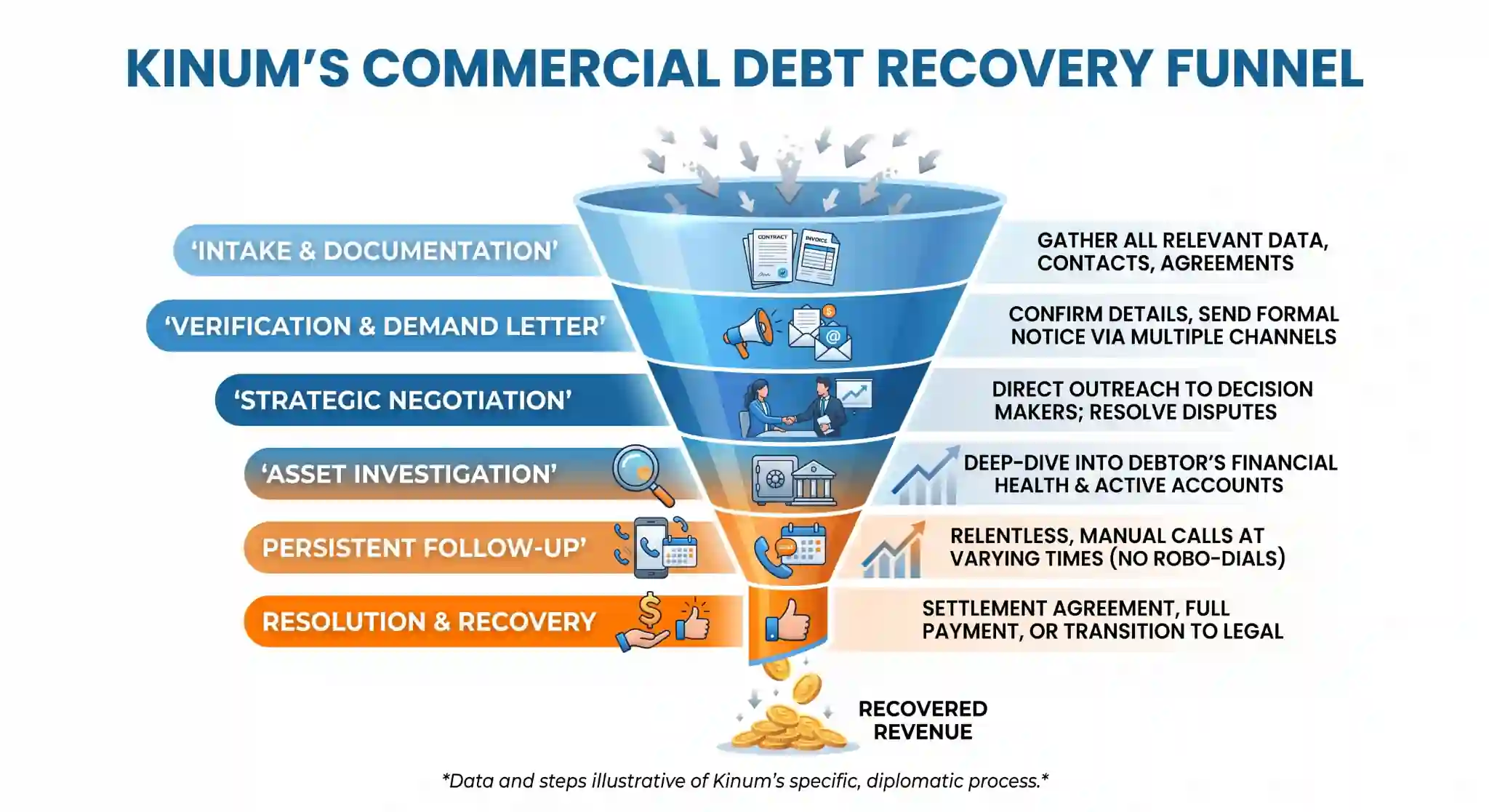 - Expertise and Resources: Kinum team includes specialists with deep knowledge of business operations, contracts, and debt collection laws, providing a strategic advantage in recovering debts.